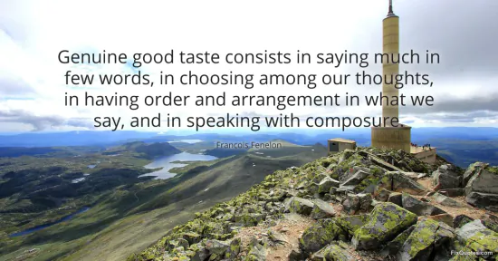 Fenelon, Francois. (2026, January 15). Genuine good taste consists in saying much in few words, in choosing among our thoughts, in having order and arrangement in what we say, and in speaking with composure. FixQuotes. https://fixquotes.com/quotes/genuine-good-taste-consists-in-saying-much-in-few-164659/