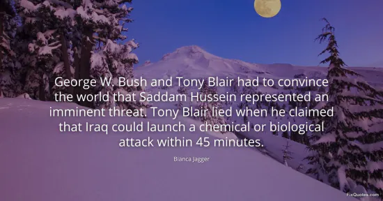 Jagger, Bianca. (2026, January 17). George W. Bush and Tony Blair had to convince the world that Saddam Hussein represented an imminent threat. Tony Blair lied when he claimed that Iraq could launch a chemical or biological attack within 45 minutes. FixQuotes. https://fixquotes.com/quotes/george-w-bush-and-tony-blair-had-to-convince-the-38431/