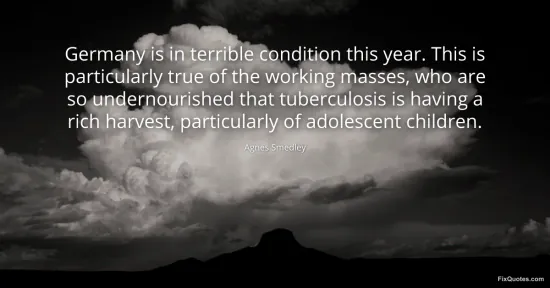 Smedley, Agnes. (2026, January 17). Germany is in terrible condition this year. This is particularly true of the working masses, who are so undernourished that tuberculosis is having a rich harvest, particularly of adolescent children. FixQuotes. https://fixquotes.com/quotes/germany-is-in-terrible-condition-this-year-this-38093/