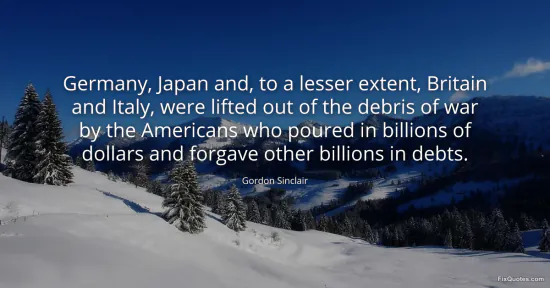 Sinclair, Gordon. (2026, January 17). Germany, Japan and, to a lesser extent, Britain and Italy, were lifted out of the debris of war by the Americans who poured in billions of dollars and forgave other billions in debts. FixQuotes. https://fixquotes.com/quotes/germany-japan-and-to-a-lesser-extent-britain-and-72349/