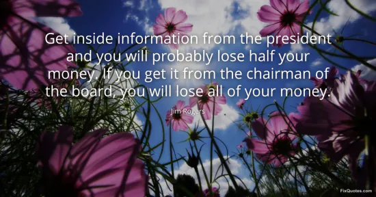 Rogers, Jim. "Get inside information from the president and you will probably lose half your money. If you get it from the chairman of the board, you will lose all of your money." FixQuotes. January 15, 2026. https://fixquotes.com/quotes/get-inside-information-from-the-president-and-you-161387/.