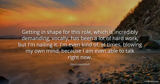 Hasselhoff, David. (2026, January 17). Getting in shape for this role, which is incredibly demanding, vocally, has been a lot of hard work, but I'm nailing it. I'm even kind of, at times, blowing my own mind, because I am even able to talk right now. FixQuotes. https://fixquotes.com/quotes/getting-in-shape-for-this-role-which-is-67450/