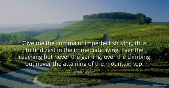 Graham, Winston. "Give me the comma of imperfect striving, thus to find zest in the immediate living. Ever the reaching but never the gaining, ever the climbing but never the attaining of the mountain top." FixQuotes. January 16, 2026. https://fixquotes.com/quotes/give-me-the-comma-of-imperfect-striving-thus-to-122525/.