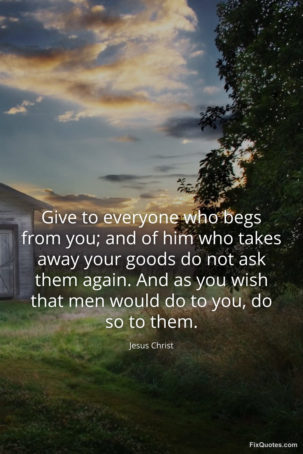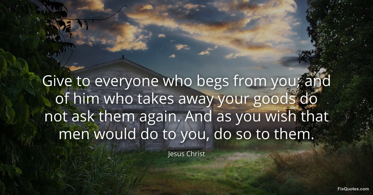 Christ, Jesus. (2026, February 18). Give to everyone who begs from you; and of him who takes away your goods do not ask them again. And as you wish that men would do to you, do so to them. FixQuotes. https://fixquotes.com/quotes/give-to-everyone-who-begs-from-you-and-of-him-who-185630/