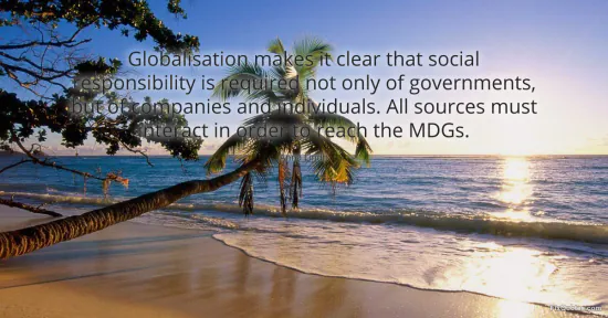 "Globalisation makes it clear that social responsibility is required not only of governments, but of companies and individuals. All sources must interact in order to reach the MDGs." FixQuotes, 15 Jan. 2026, https://fixquotes.com/quotes/globalisation-makes-it-clear-that-social-43170/. Accessed 12 Feb. 2026.