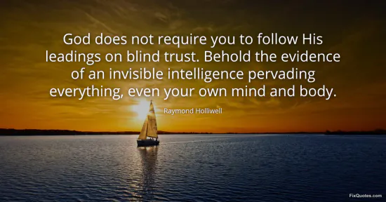 Holliwell, Raymond. (2026, January 14). God does not require you to follow His leadings on blind trust. Behold the evidence of an invisible intelligence pervading everything, even your own mind and body. FixQuotes. https://fixquotes.com/quotes/god-does-not-require-you-to-follow-his-leadings-89263/