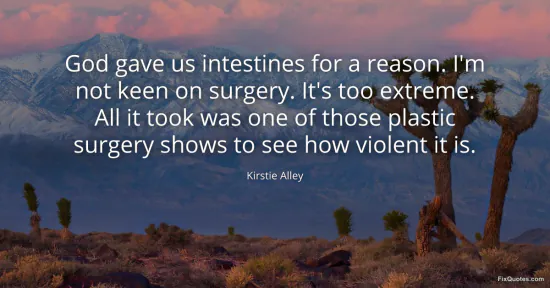 Alley, Kirstie. (2026, January 16). God gave us intestines for a reason. I'm not keen on surgery. It's too extreme. All it took was one of those plastic surgery shows to see how violent it is. FixQuotes. https://fixquotes.com/quotes/god-gave-us-intestines-for-a-reason-im-not-keen-103980/