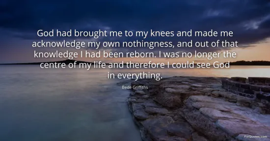 Griffiths, Bede. "God had brought me to my knees and made me acknowledge my own nothingness, and out of that knowledge I had been reborn. I was no longer the centre of my life and therefore I could see God in everything." FixQuotes. January 18, 2026. https://fixquotes.com/quotes/god-had-brought-me-to-my-knees-and-made-me-5708/.