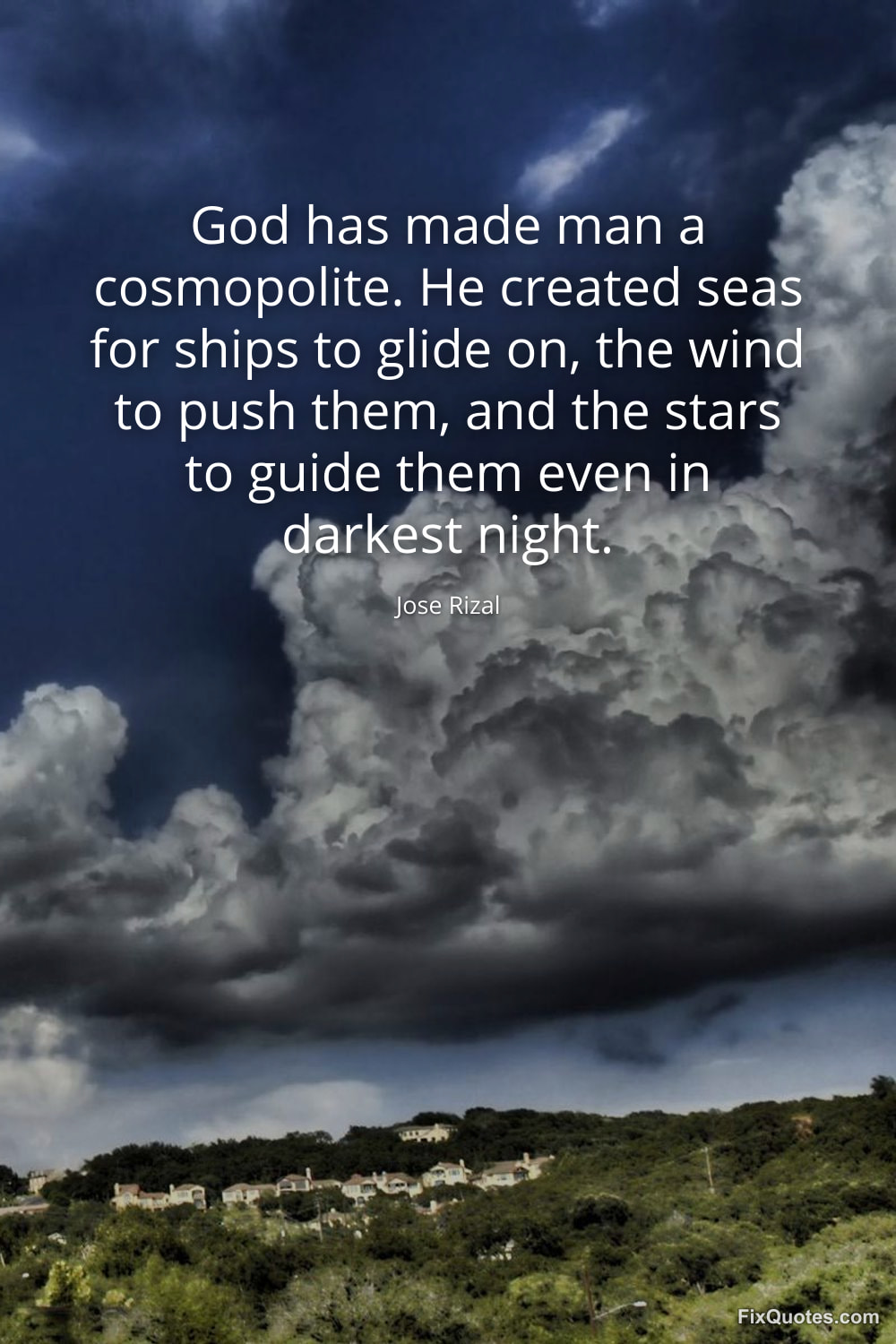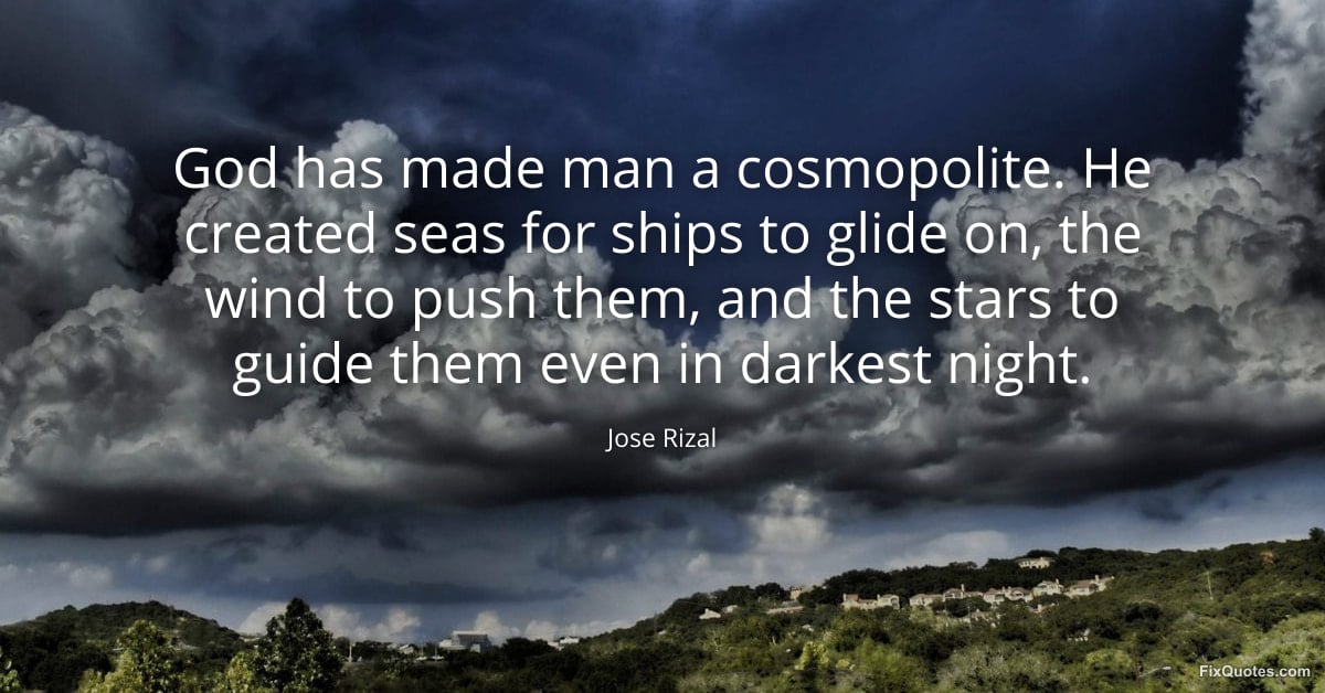 Rizal, Jose. "God has made man a cosmopolite. He created seas for ships to glide on, the wind to push them, and the stars to guide them even in darkest night." FixQuotes. February 10, 2026. https://fixquotes.com/quotes/god-has-made-man-a-cosmopolite-he-created-seas-185100/.