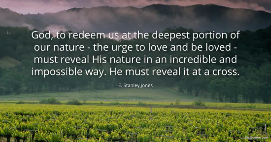 Jones, E. Stanley. "God, to redeem us at the deepest portion of our nature - the urge to love and be loved - must reveal His nature in an incredible and impossible way. He must reveal it at a cross." FixQuotes. January 18, 2026. https://fixquotes.com/quotes/god-to-redeem-us-at-the-deepest-portion-of-our-9763/.