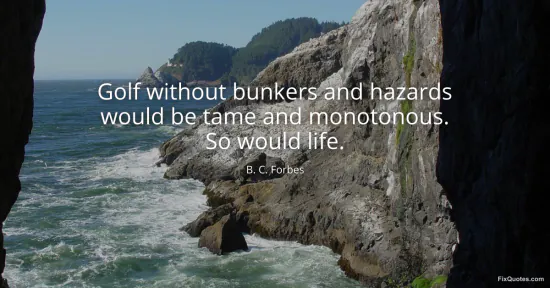Forbes, B. C. "Golf without bunkers and hazards would be tame and monotonous. So would life." FixQuotes. January 15, 2026. https://fixquotes.com/quotes/golf-without-bunkers-and-hazards-would-be-tame-138389/.