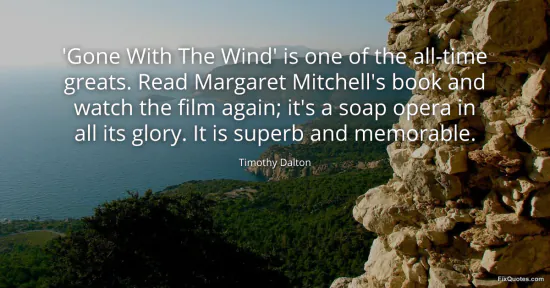 Dalton, Timothy. "'Gone With The Wind' is one of the all-time greats. Read Margaret Mitchell's book and watch the film again; it's a soap opera in all its glory. It is superb and memorable." FixQuotes. January 17, 2026. https://fixquotes.com/quotes/gone-with-the-wind-is-one-of-the-all-time-greats-72422/.
