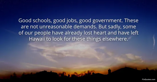 Lingle, Linda. "Good schools, good jobs, good government. These are not unreasonable demands. But sadly, some of our people have already lost heart and have left Hawaii to look for these things elsewhere." FixQuotes. January 16, 2026. https://fixquotes.com/quotes/good-schools-good-jobs-good-government-these-are-103805/.