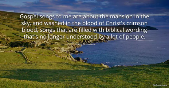 Norman, Larry. "Gospel songs to me are about the mansion in the sky, and washed in the blood of Christ's crimson blood, songs that are filled with biblical wording that's no longer understood by a lot of people." FixQuotes. January 16, 2026. https://fixquotes.com/quotes/gospel-songs-to-me-are-about-the-mansion-in-the-84460/.