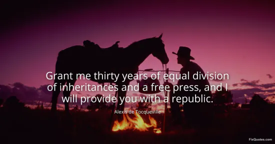 Tocqueville, Alexis de. "Grant me thirty years of equal division of inheritances and a free press, and I will provide you with a republic." FixQuotes. January 15, 2026. https://fixquotes.com/quotes/grant-me-thirty-years-of-equal-division-of-16709/.