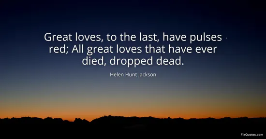 Jackson, Helen Hunt. "Great loves, to the last, have pulses red; All great loves that have ever died, dropped dead." FixQuotes. February 18, 2026. https://fixquotes.com/quotes/great-loves-to-the-last-have-pulses-red-all-great-59777/.