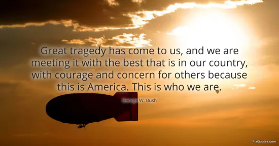 Bush, George W. (2026, January 15). Great tragedy has come to us, and we are meeting it with the best that is in our country, with courage and concern for others because this is America. This is who we are. FixQuotes. https://fixquotes.com/quotes/great-tragedy-has-come-to-us-and-we-are-meeting-7264/