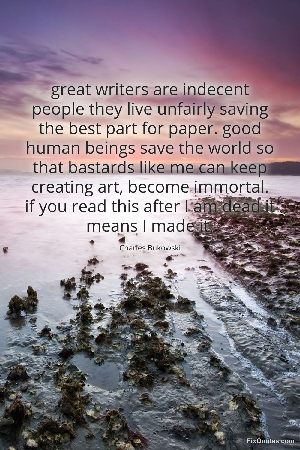 Bukowski, Charles. "great writers are indecent people they live unfairly saving the best part for paper. good human beings save the world so that bastards like me can keep creating art, become immortal. if you read this after I am dead it means I made it." FixQuotes. February 10, 2026. https://fixquotes.com/quotes/great-writers-are-indecent-people-they-live-185197/.
