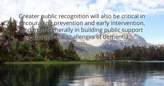 Bishop, Julie. "Greater public recognition will also be critical in encouraging prevention and early intervention, and more generally in building public support to meet the challenges of dementia." FixQuotes. January 17, 2026. https://fixquotes.com/quotes/greater-public-recognition-will-also-be-critical-75416/.