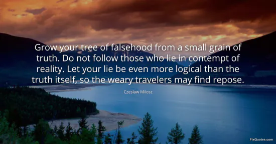 Milosz, Czeslaw. (2026, January 14). Grow your tree of falsehood from a small grain of truth. Do not follow those who lie in contempt of reality. Let your lie be even more logical than the truth itself, so the weary travelers may find repose. FixQuotes. https://fixquotes.com/quotes/grow-your-tree-of-falsehood-from-a-small-grain-of-45389/
