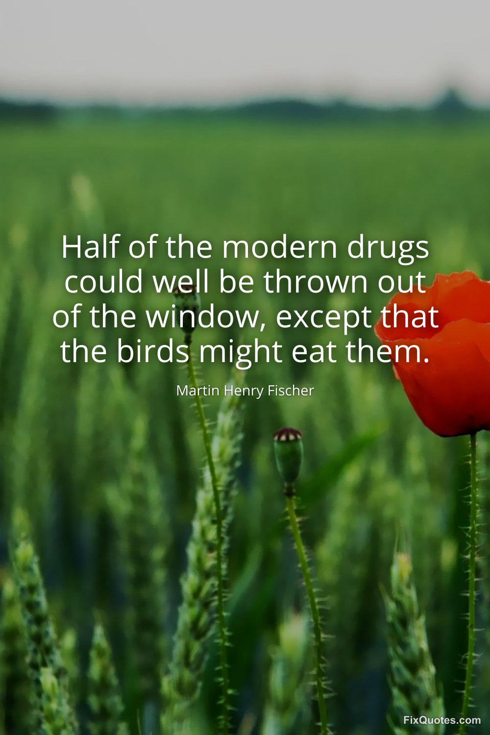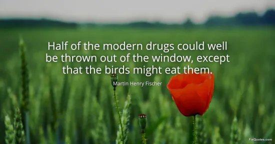 Fischer, Martin Henry. (2026, January 16). Half of the modern drugs could well be thrown out of the window, except that the birds might eat them. FixQuotes. https://fixquotes.com/quotes/half-of-the-modern-drugs-could-well-be-thrown-out-127485/