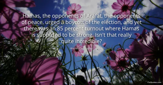 Christopher, Warren. (2026, January 18). Hamas, the opponents of Arafat, the opponents of peace, urged a boycott of the election, and yet there was an 85 percent turnout where Hamas is supposed to be strong. Isn't that really quite incredible? FixQuotes. https://fixquotes.com/quotes/hamas-the-opponents-of-arafat-the-opponents-of-5894/