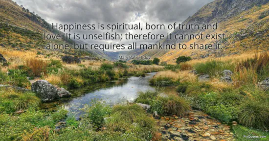 "Happiness is spiritual, born of truth and love. It is unselfish; therefore it cannot exist alone, but requires all mankind to share it." FixQuotes, 15 Jan. 2026, https://fixquotes.com/quotes/happiness-is-spiritual-born-of-truth-and-love-it-9858/. Accessed 12 Feb. 2026.