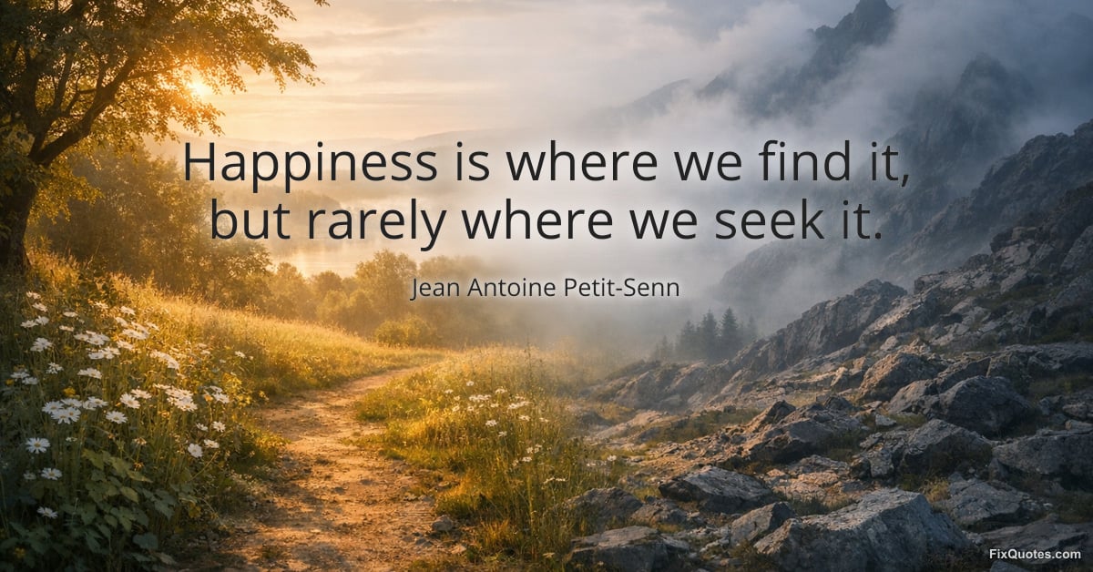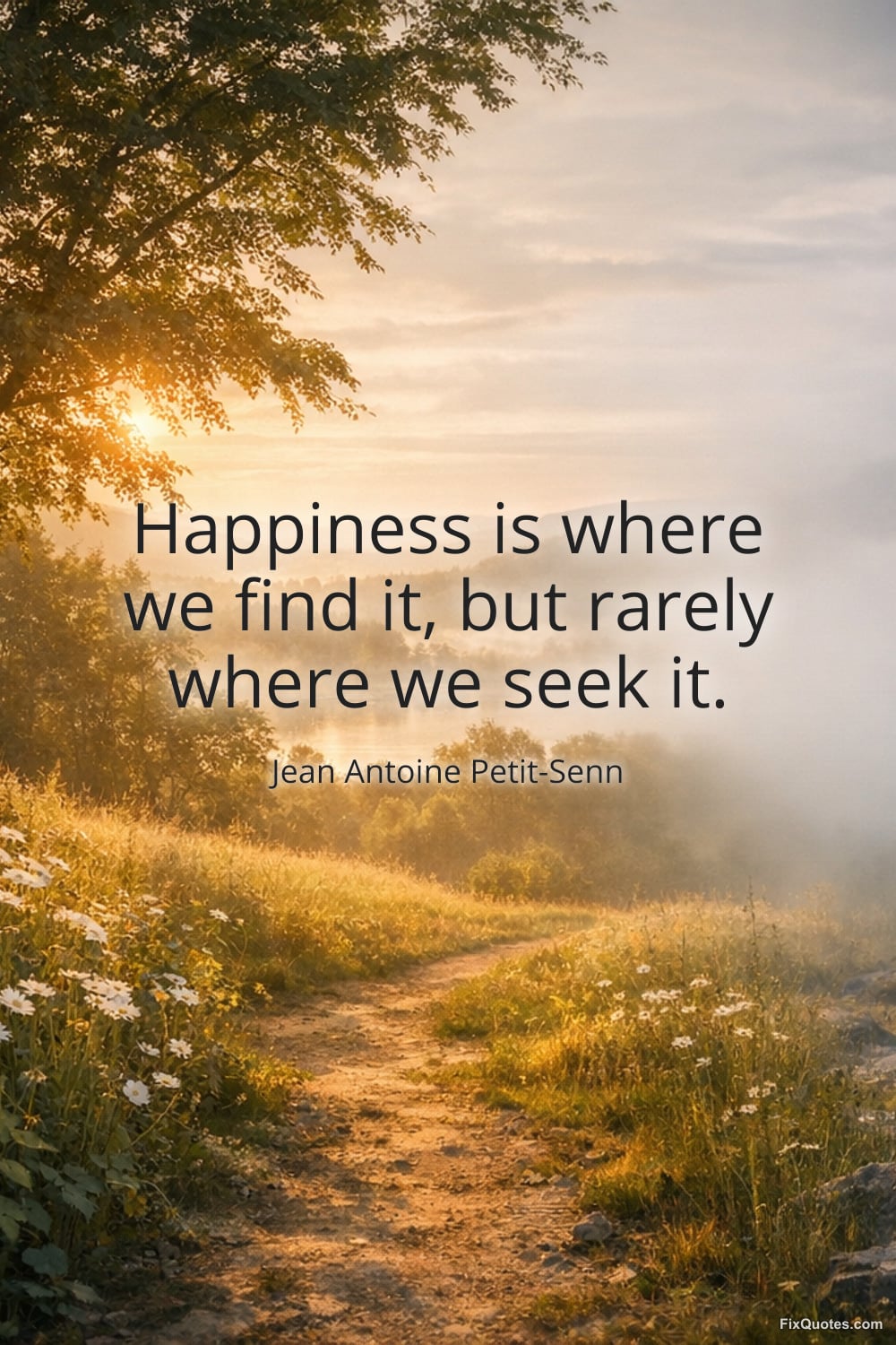 Petit-Senn, Jean Antoine. (2026, February 18). Happiness is where we find it, but rarely where we seek it. FixQuotes. https://fixquotes.com/quotes/happiness-is-where-we-find-it-but-rarely-where-we-171410/