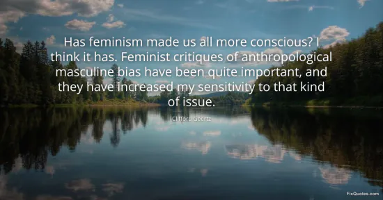 Geertz, Clifford. (2026, January 15). Has feminism made us all more conscious? I think it has. Feminist critiques of anthropological masculine bias have been quite important, and they have increased my sensitivity to that kind of issue. FixQuotes. https://fixquotes.com/quotes/has-feminism-made-us-all-more-conscious-i-think-145666/