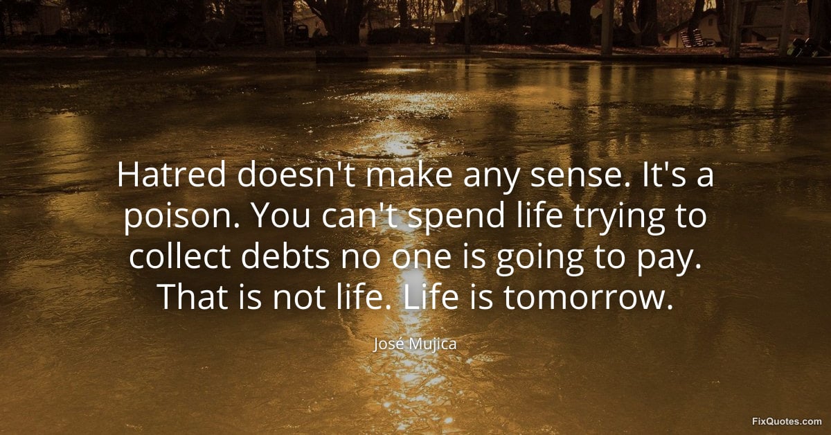 Mujica, José. (2026, March 7). Hatred doesn't make any sense. It's a poison. You can't spend life trying to collect debts no one is going to pay. That is not life. Life is tomorrow. FixQuotes. https://fixquotes.com/quotes/hatred-doesnt-make-any-sense-its-a-poison-you-185695/