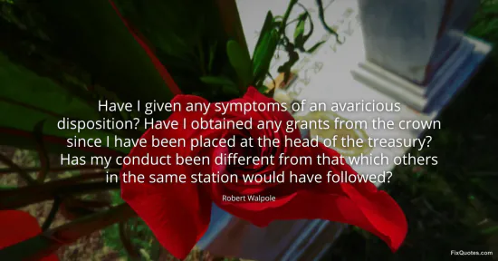 Walpole, Robert. (2026, January 18). Have I given any symptoms of an avaricious disposition? Have I obtained any grants from the crown since I have been placed at the head of the treasury? Has my conduct been different from that which others in the same station would have followed? FixQuotes. https://fixquotes.com/quotes/have-i-given-any-symptoms-of-an-avaricious-4730/