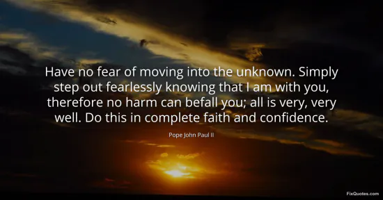 II, Pope John Paul. "Have no fear of moving into the unknown. Simply step out fearlessly knowing that I am with you, therefore no harm can befall you; all is very, very well. Do this in complete faith and confidence." FixQuotes. January 18, 2026. https://fixquotes.com/quotes/have-no-fear-of-moving-into-the-unknown-simply-1244/.