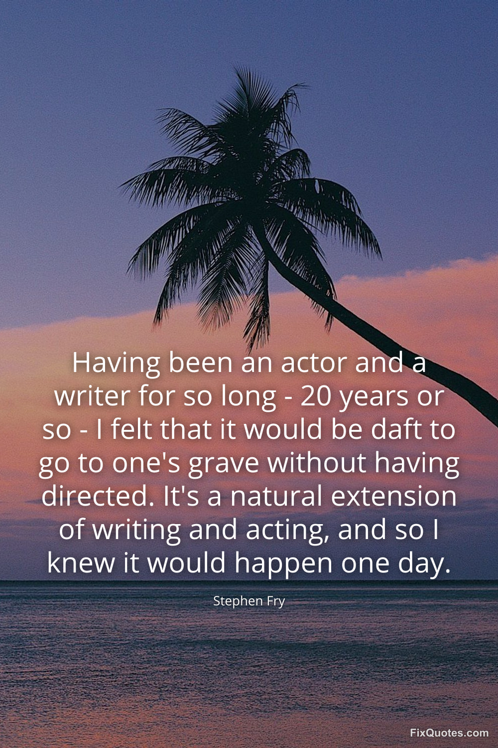 Fry, Stephen. "Having been an actor and a writer for so long - 20 years or so - I felt that it would be daft to go to one's grave without having directed. It's a natural extension of writing and acting, and so I knew it would happen one day." FixQuotes. January 16, 2026. https://fixquotes.com/quotes/having-been-an-actor-and-a-writer-for-so-long-119068/.