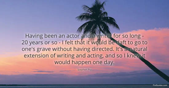 Fry, Stephen. (2026, January 16). Having been an actor and a writer for so long - 20 years or so - I felt that it would be daft to go to one's grave without having directed. It's a natural extension of writing and acting, and so I knew it would happen one day. FixQuotes. https://fixquotes.com/quotes/having-been-an-actor-and-a-writer-for-so-long-119068/
