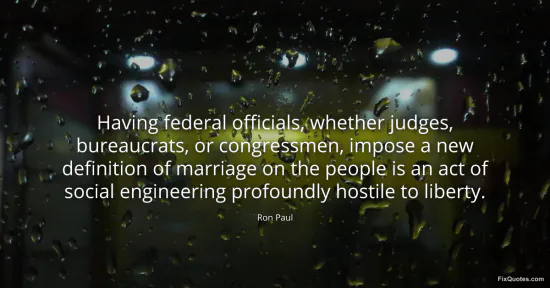 Paul, Ron. "Having federal officials, whether judges, bureaucrats, or congressmen, impose a new definition of marriage on the people is an act of social engineering profoundly hostile to liberty." FixQuotes. January 17, 2026. https://fixquotes.com/quotes/having-federal-officials-whether-judges-25570/.