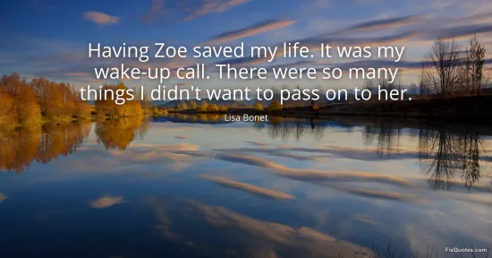 Bonet, Lisa. (2026, January 15). Having Zoe saved my life. It was my wake-up call. There were so many things I didn't want to pass on to her. FixQuotes. https://fixquotes.com/quotes/having-zoe-saved-my-life-it-was-my-wake-up-call-131273/