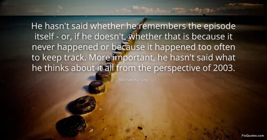 Kinsley, Michael. "He hasn't said whether he remembers the episode itself - or, if he doesn't, whether that is because it never happened or because it happened too often to keep track. More important, he hasn't said what he thinks about it all from the perspective of 2003." FixQuotes. January 15, 2026. https://fixquotes.com/quotes/he-hasnt-said-whether-he-remembers-the-episode-150991/.
