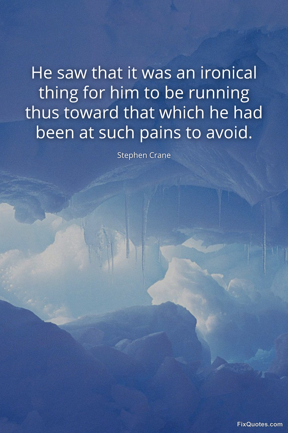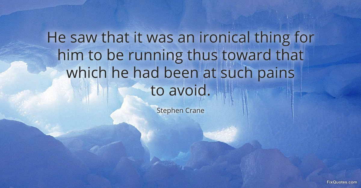 Crane, Stephen. "He saw that it was an ironical thing for him to be running thus toward that which he had been at such pains to avoid." FixQuotes. January 15, 2026. https://fixquotes.com/quotes/he-saw-that-it-was-an-ironical-thing-for-him-to-173382/.