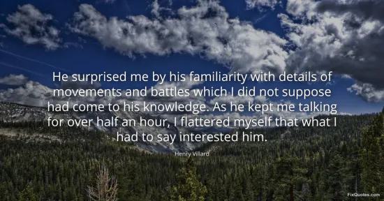 Villard, Henry. (2026, January 17). He surprised me by his familiarity with details of movements and battles which I did not suppose had come to his knowledge. As he kept me talking for over half an hour, I flattered myself that what I had to say interested him. FixQuotes. https://fixquotes.com/quotes/he-surprised-me-by-his-familiarity-with-details-55036/