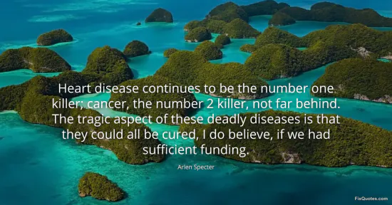Specter, Arlen. "Heart disease continues to be the number one killer; cancer, the number 2 killer, not far behind. The tragic aspect of these deadly diseases is that they could all be cured, I do believe, if we had sufficient funding." FixQuotes. January 17, 2026. https://fixquotes.com/quotes/heart-disease-continues-to-be-the-number-one-38855/.
