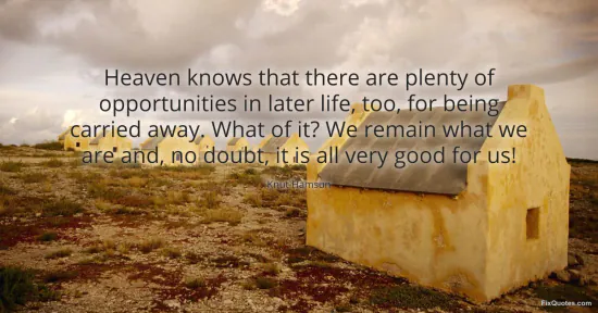 Hamsun, Knut. "Heaven knows that there are plenty of opportunities in later life, too, for being carried away. What of it? We remain what we are and, no doubt, it is all very good for us!" FixQuotes. January 17, 2026. https://fixquotes.com/quotes/heaven-knows-that-there-are-plenty-of-32701/.