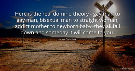 Quindlen, Anna. (2026, January 18). Here is the real domino theory - gay man to gay man, bisexual man to straight woman, addict mother to newborn baby, they all fall down and someday it will come to you. FixQuotes. https://fixquotes.com/quotes/here-is-the-real-domino-theory-gay-man-to-gay-1304/