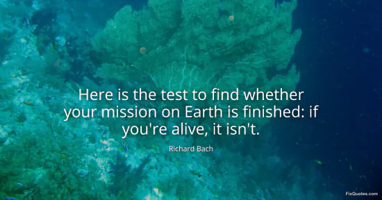 Bach, Richard. "Here is the test to find whether your mission on Earth is finished: if you're alive, it isn't." FixQuotes. January 14, 2026. https://fixquotes.com/quotes/here-is-the-test-to-find-whether-your-mission-on-1348/.