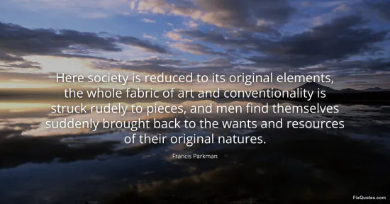 Parkman, Francis. "Here society is reduced to its original elements, the whole fabric of art and conventionality is struck rudely to pieces, and men find themselves suddenly brought back to the wants and resources of their original natures." FixQuotes. January 17, 2026. https://fixquotes.com/quotes/here-society-is-reduced-to-its-original-elements-54646/.