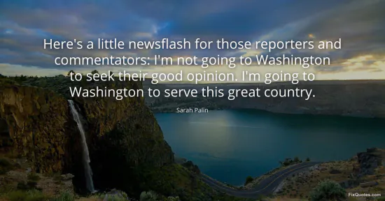 Palin, Sarah. "Here's a little newsflash for those reporters and commentators: I'm not going to Washington to seek their good opinion. I'm going to Washington to serve this great country." FixQuotes. January 18, 2026. https://fixquotes.com/quotes/heres-a-little-newsflash-for-those-reporters-and-1743/.