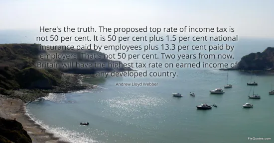 Webber, Andrew Lloyd. (2026, January 16). Here's the truth. The proposed top rate of income tax is not 50 per cent. It is 50 per cent plus 1.5 per cent national insurance paid by employees plus 13.3 per cent paid by employers. That's not 50 per cent. Two years from now, Britain will have the highest tax rate on earned income of any developed country. FixQuotes. https://fixquotes.com/quotes/heres-the-truth-the-proposed-top-rate-of-income-113313/