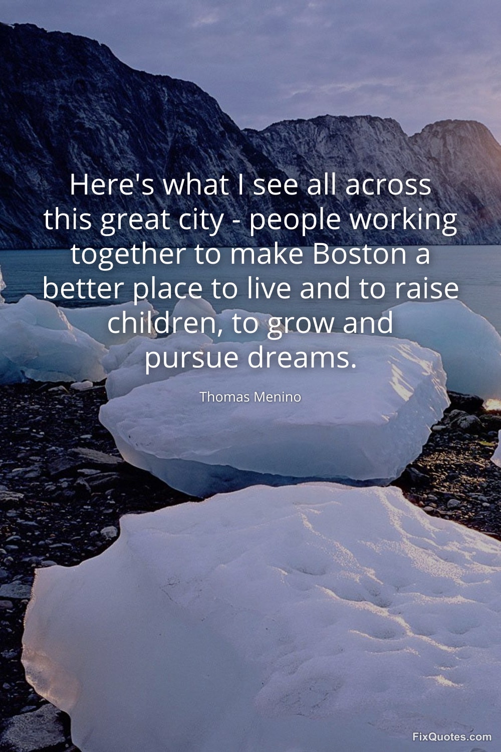 Menino, Thomas. (2026, January 16). Here's what I see all across this great city - people working together to make Boston a better place to live and to raise children, to grow and pursue dreams. FixQuotes. https://fixquotes.com/quotes/heres-what-i-see-all-across-this-great-city-92226/