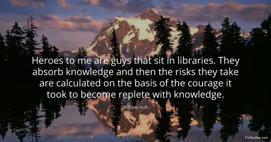 Hurt, William. "Heroes to me are guys that sit in libraries. They absorb knowledge and then the risks they take are calculated on the basis of the courage it took to become replete with knowledge." FixQuotes. January 16, 2026. https://fixquotes.com/quotes/heroes-to-me-are-guys-that-sit-in-libraries-they-85067/.