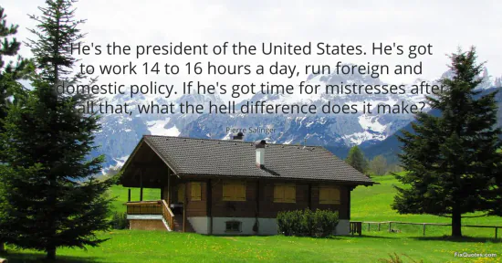 Salinger, Pierre. "He's the president of the United States. He's got to work 14 to 16 hours a day, run foreign and domestic policy. If he's got time for mistresses after all that, what the hell difference does it make?" FixQuotes. January 17, 2026. https://fixquotes.com/quotes/hes-the-president-of-the-united-states-hes-got-to-71811/.