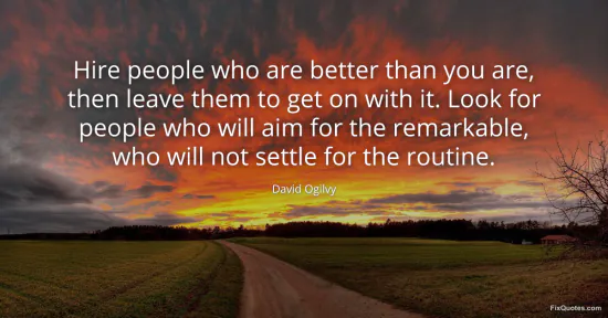 Ogilvy, David. (2026, January 17). Hire people who are better than you are, then leave them to get on with it. Look for people who will aim for the remarkable, who will not settle for the routine. FixQuotes. https://fixquotes.com/quotes/hire-people-who-are-better-than-you-are-then-30744/